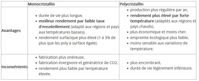 Il existe principalement deux technologies de fabrication des cellules de panneaux photovoltaïques, voici un récapitulatif de leur emploi :